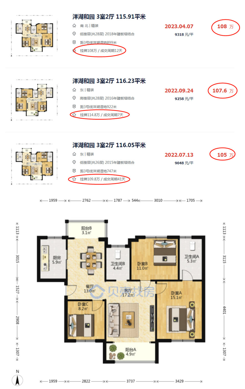 貝殼二手房同戶型成交價(jià)在108萬左右(請注意看成交周期,都很快,掛出來十幾天就成交了),妥妥的撿漏四十萬。