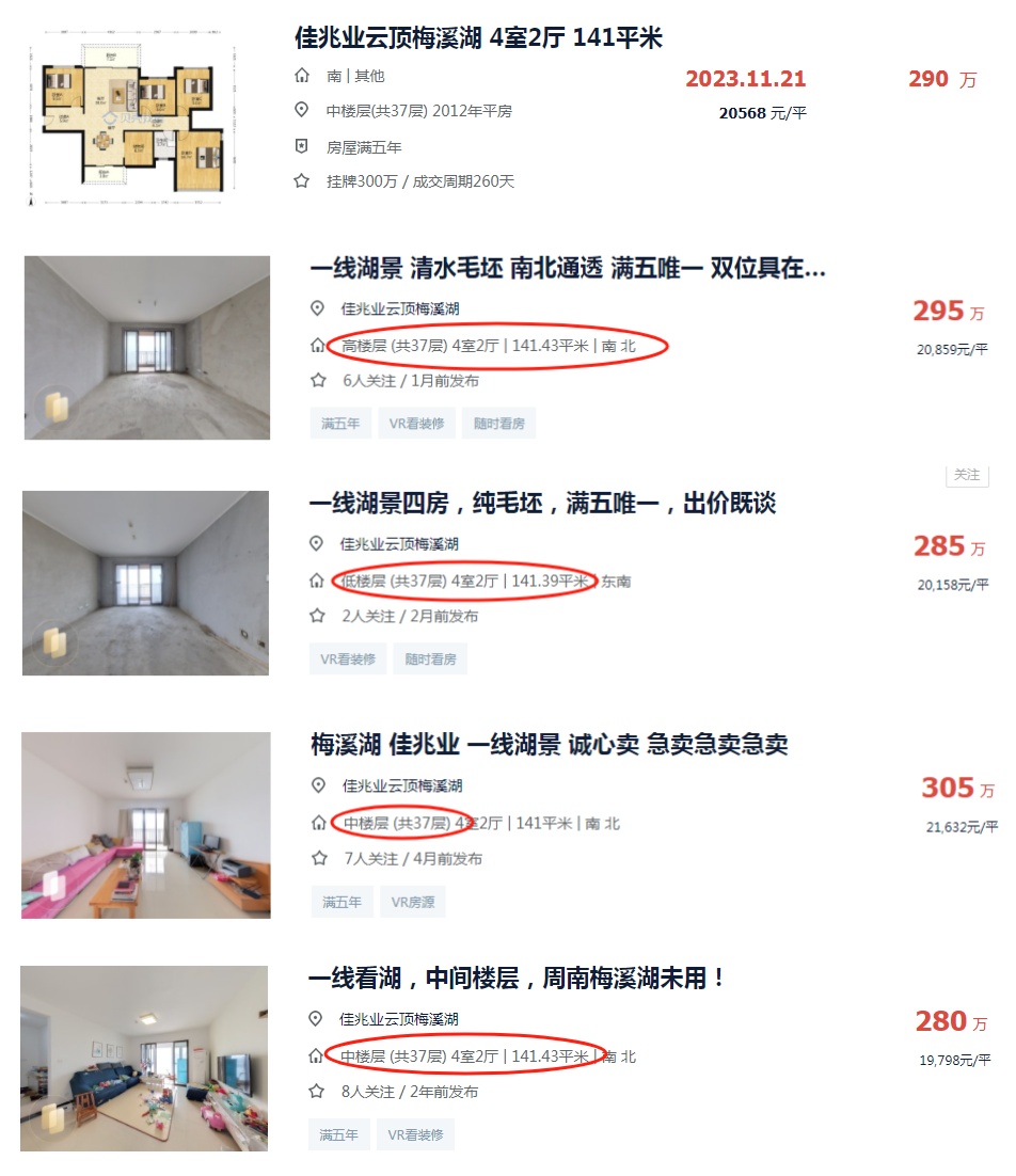我認為撿漏了30-50萬,因為小區(qū)同樣的一線湖景房(老彭都是參考的141平四房,同樣總高37層的房子,這樣大概率是同類型的房子),貝殼最新成交價是290萬,貝殼的掛牌價是280-305萬之間(中高樓層的只有4套)。最低掛牌價280萬的那套裝修很一般(如下圖,既無中央空調(diào)又無地暖,甚至連柜子都沒做),跟咱拍的這套裝修不在一個檔次,所以絕對撿漏了30-50萬。